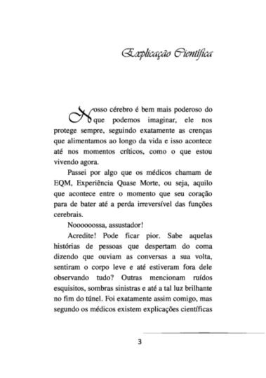 Nessa história você vai conhecer o bombeiro Luidi e a jovem fotógrafa Gisely, que numa noite entre amigos em um bar da cidade acabam alvejados por tiros, juntos vivem uma EQM, ou seja, experiência quase morte e descobrem que existe muito mais entre a vida e a morte do que se pode imaginar.